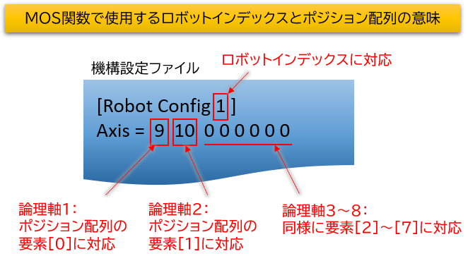 このロボットをMOS関数で扱う場合、ポジション配列の要素[0]に論理軸1を介して物理軸9の位置情報を、要素[1]に論理軸2を介して物理軸10の位置情報を格納します。0がアサインされた論理軸、この例では要素[2]~[7]は考慮されません。