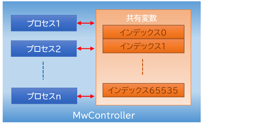 共有変数は、MwControllerで実行されている複数のプロセスの共有リソースで、short型、long(int)型、float型、double型を扱うことができます。また、インデックス番号が58000~58999の範囲の共有変数は、文字列(Null終端のchar型配列)を扱うことができます。文字列の最大文字数は、Null終端を含まず256バイトです。